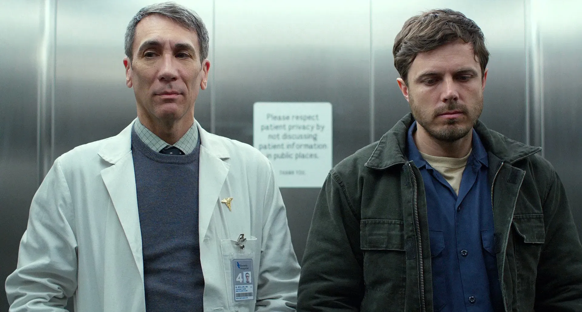 Cast: Casey Affleck as Lee Chandler, Lucas Hedges as Patrick Chandler, Michelle Williams as Randi Chandler, Kyle Chandler as Joe Chandler, C.J. Wilson as George, Gretchen Mol as Elise Chandler, Heather Burns as Jill, Ivy O'Brien as Young Patrick Chandler, Josh Hamilton as Wes (Joe's Lawyer), Matthew Broderick as Jeffrey, Tate Donovan as Hockey Coach, Anna Baryshnikov as Sandy, Richard Donelly as Mr. Martinez (1st Tenant), Virginia Loring Cooke as Mrs. Groom (2nd Tenant), Quincy Tyler Bernstine as Marianne (3rd Tenant), Missy Yager as Mrs. Olsen (4th Tenant), Stephen McKinley Henderson as Mr. Emery, Ben Hanson as Bartender, Mary Mallen as Sharon, Lewis D. Wheeler as 1st Businessman at Bar, Anthony Estrella as 2nd Businessman at Bar, Susan Pourfar as Nurse Irene, Robert Sella as Dr. Muller, Ruibo Qian as Dr. Bethany, Tom Kemp as Stan Chandler, Chloe Dixon as Suzy Chandler, Ellie Teves as Karen Chandler, Paul Meredith as Paul (Assistant Principal), Carolyn Pickman as Paul's Assistant, Christian J. Mallen as CJ, Oscar Wahlberg as Joel, Kara Hayward as Silvie, Wendy Overly as Wes's Assistant, Shawn Fitzgibbon as Tom Doherty (Ping-Pong Player), Glenn McKiel as Manchester Police Chief, Joe Stapleton as Fire Marshall, Brian Chamberlain as Investigating Detective, Kenneth Lonergan as Manchester Pedestrian, Jackson Damon as Otto, Jami Tennille as Janine, Liam McNeill as Josh (Randi's Husband), Allyn Burrows as Father Martin, Nellie Lonergan as 1st Girl at School ("Godspell"), Brian A. White as Jerry (Guy in Boat Yard Office), Erica McDermott as Sue (Angry Boss in Boat Yard Office), Danae Nason as Rachel (Randi's Friend), Frank Garvin as Homeowner, William Bornkessel as George's Son, Kt Baldassaro as Bar Patron (uncredited), Zain Ullah as Young Micheal, Amanda Blattner as